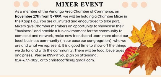 If you are planning to attend, RSVP at 814-677-3023 or email at christocoffice@gmail.com.