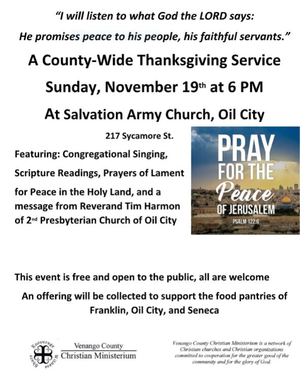 Featuring: Congregational Singing, Scripture Readings, Prayers of Lament for Peace in the Holy Land, and a message from Reverand Tim Harmon of 2nd Presbyterian Church of Oil City.