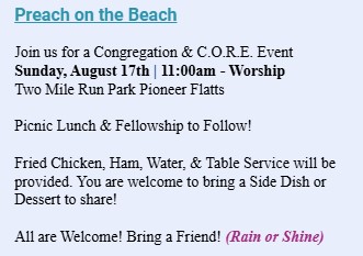Two Mile Run County Park 471 Beach Rd,, Franklin, United StatesPreach on the Beach. Join us for C.O.R.E Sunday Worship [...]